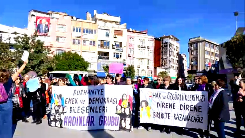 Balıkesir'in Burhaniye ilçesinde kadınlar Emek ve Demokrasi Bileşenleri Kadınlar Grubunun çağrısıyla sokağa çıktı. 25 Kasım kapsamında ilçe merkezinde bir araya gelen kadınlar sloganlarla ve dövizlerle şiddete, yoksulluğa, sömürüye ve eşitsizliğe karşı ses yükseltti.