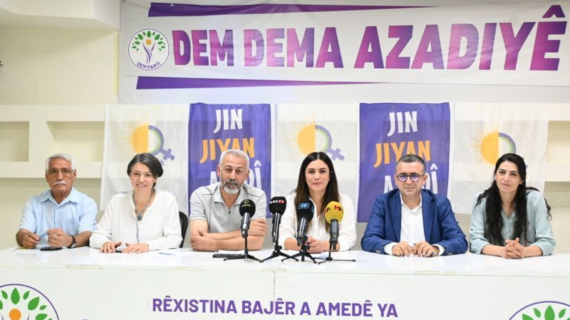 Demokratik Kurumlar Platformu, Özgür Kadın Hareketi'nin (TJA) organize ettiği, 1 Ekim'de "Umutla özgürlüğe yürüyoruz" şiarıyla Diyarbakır'dan Ankara'ya yapılacak yürüyüşe dair Halkların Eşitlik ve Demokrasi Partisi (DEM Parti) Diyarbakır İl Örgütü'nde basın toplantısı düzenledi.