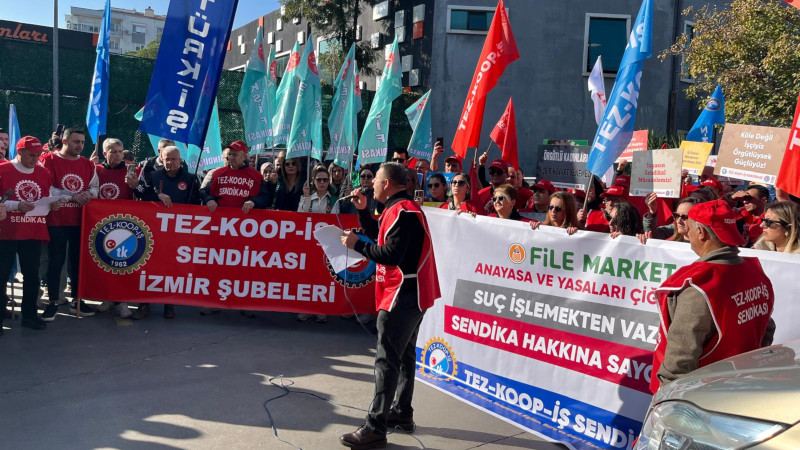Tez Koop-İş Sendikası'na üye File Market işçileri, patronun sendikal örgütlülüğü engellemek için tehditler savurmasına, fişlemeye, e-devlet şifrelerini istemesine ve son olarak da "performans yetersizliği" bahanesiyle işten atma saldırısına karşı İstanbul'da başlattıkları direnişin sesini bugün İzmir'den yükseltti.
