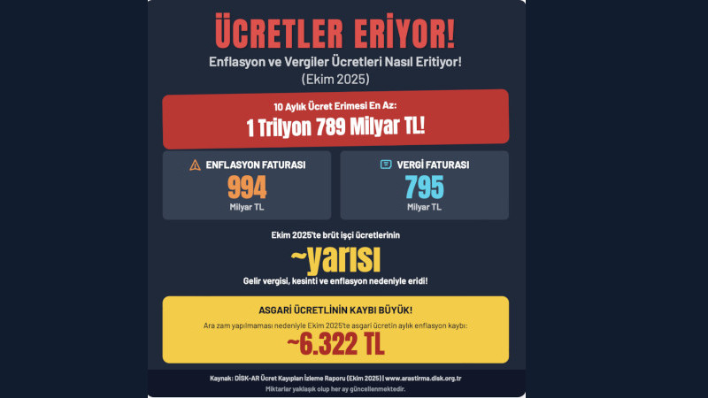 "Sadece sigortalı işçilerin aylık enflasyon kaybı Ekim 2025'te toplam (tüm işçiler için) 184,6 milyar TL'ye ulaşırken enflasyon ve vergi kaynaklı toplam erime 310,1 milyar lira oldu. On aylık birikimli erime (on ayın toplamı) ise akıllara durgunluk verecek düzeye yükseldi ve 1,8 trilyon liraya yaklaştı. Özellikle asgari ücrete Temmuz 2025'te ara zam yapılmaması kayıpları daha da büyüttü. Artan gelir vergisi yükü nedeniyle tüm işçiler için yaşanan on aylık birikimli toplam ücret erimesi (kesintiler hariç) 794,6 milyar lira olurken enflasyonun yarattığı kayıp ise 994,4 milyar liraya ulaştı. Böylece artan gelir vergisi yükü ve enflasyonun yaklaşık 17 milyon işçinin ücretlerinde yarattığı on aylık kayıp en az 1 trilyon 789 milyar lira oldu. 1 trilyon 789 milyar lirayı aşan bu erime işçilerden varlıklı kesimlere ciddi bir gelir transferi anlamına geliyor."