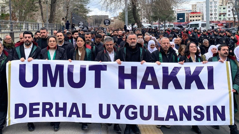 Diyarbakır'da 'umut hakkı' talebiyle yürüyen avukatlar, "Umut hakkının güvenceye" alınmasını istedi.