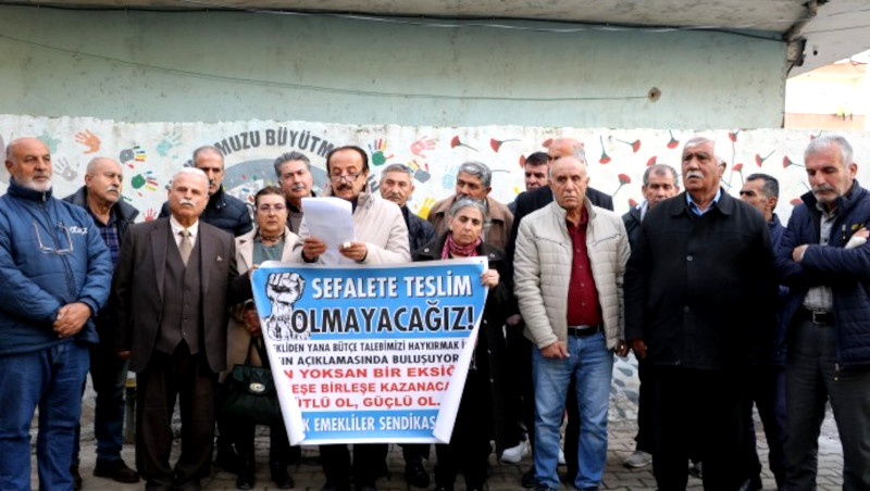 İktidarın savaş ve sermaye bütçesine karşı tepkiler devam ediyor. Birleşik Emekliler Sendikası (BES), Diyarbakır'ın Bismil ilçesi Fırat Mahallesinde bulunan Bismil Eğitim ve Bilim Emekçileri Sendikası (Eğitim Sen) bahçesinde açıklama yaptı. "Sefalete teslim olmayacağız" pankartının açıldığı açıklamayı BES üyesi Osman Bakır yaptı. Emeklilerin maaşlarının her gün biraz daha eridiğini, alım gücünün azaldığını ifade eden Bakır, "Baskılanmış ve nasıl saptandığı sır gibi saklanan Türkiye İstatistik Kurumu verileri ile bizlere sadaka gibi bir maaş reva görülüyor. Oysa biz emekliler 2002 yılına kadar olan dönemde asgari ücretin yüzde 40 kadar fazlası maaş alıyorduk. Bugün ise asgari ücretin yarısına yakın maaş almaktayız" diye konuştu.