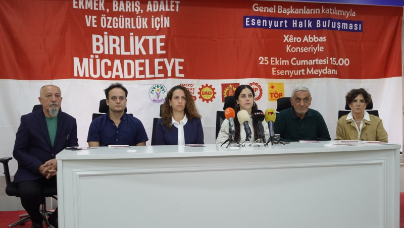 DEM Parti, EHP, EMEP, TİP, SMF ve TÖP, tüm İstanbul halkını 25 Ekim'de Esenyurt'ta "Ekmek, barış, adalet ve özgürlük için birlikte mücadeleye" şiarıyla düzenlenecek halk buluşmasına çağırdı.