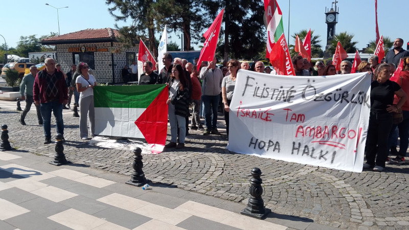 "Dünyanın birçok ülkesinde işçiler, emekçiler, halklar Filistin ile giderek güçlenen bir dayanışma içinde. Avrupa'da farklı ülkelerde işçiler limanlarda İsrail gemilerini yüklemiyor, geçişine izin vermiyor. Kentlerde kitlesel dayanışma eylemleri gerçekleştiriliyor. Filistin için grev çağrıları yapılıyor. Emperyalist-siyonist saldırganlığı durdurmak için tüm insanlığı ayağa kalkmaya çağırıyorlar" diyen Altınkaya, fabrikada, evde, okulda, sokakta, her yerde Filistin'in sesi olma çağrısı yaptı.