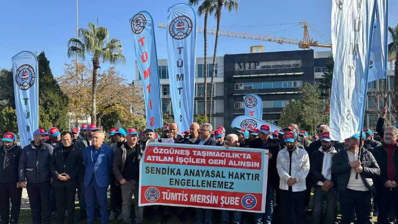 Tüm Taşıma İşçileri Sendikası (TÜMTİS) üyesi işçiler, Mersin Uluslararası Liman İşletmeciliği A.Ş (MIP) ve taşeron şirketi Özgüneş Taşımacılık tarafından 180 işçinin işten çıkarılmasını MIP binası önünde protesto etti. "Özgüneş Taşımacılık'ta atılan işçiler geri alınsın, sendika anayasal haktır engellenemez" yazılı pankartın açıldığı eylemde "İşçiyiz, haklıyız, kazanacağız", "İş, ekmek yoksa barış da yok", "İşçiler burada yetkililer nerede" sloganları atıldı.