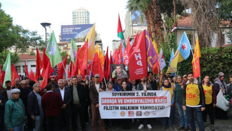 Alsancak'ta bulunan ÖSYM binası önünde yan yana gelen siyasi partiler ve demokratik kitle örgütleri, Türkan Saylan Kültür Merkezi'ne yürüdü. "Soykırımın 2'nci yılında savaşa ve emperyalizme karşı Filistin halkının yanındayız" pankartı açılan yürüyüşte, "Bölgede barış, ülkede demokrasi", "İsrail'i destekleyen politikalara son" dövizleri taşındı. Yürüyüş boyunca "Katil İsrail işbirlikçi AKP", "Savaşa hayır barış hemen şimdi" sloganları atıldı. Kitle, yürüyüşün ardından İzmir Emek ve Demokrasi Platformu ile birleşerek, Türkan Saylan Kültür Merkezi önünde basın açıklaması gerçekleştirdi.