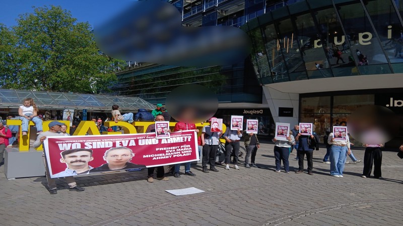 HTŞ çeteleri tarafından kaçırılan gazeteci arkadaşlarımız Eva Maria Michelmann ve Ahmet Polad için Stuttgart'ta gerçekleştirilen eylemde, Eva ve Ahmet başta olmak üzere tüm esirlerin serbest bırakılması istenirken Alman hükümetine de sorumluluğunu yerine getirme çağrısı yapıldı.