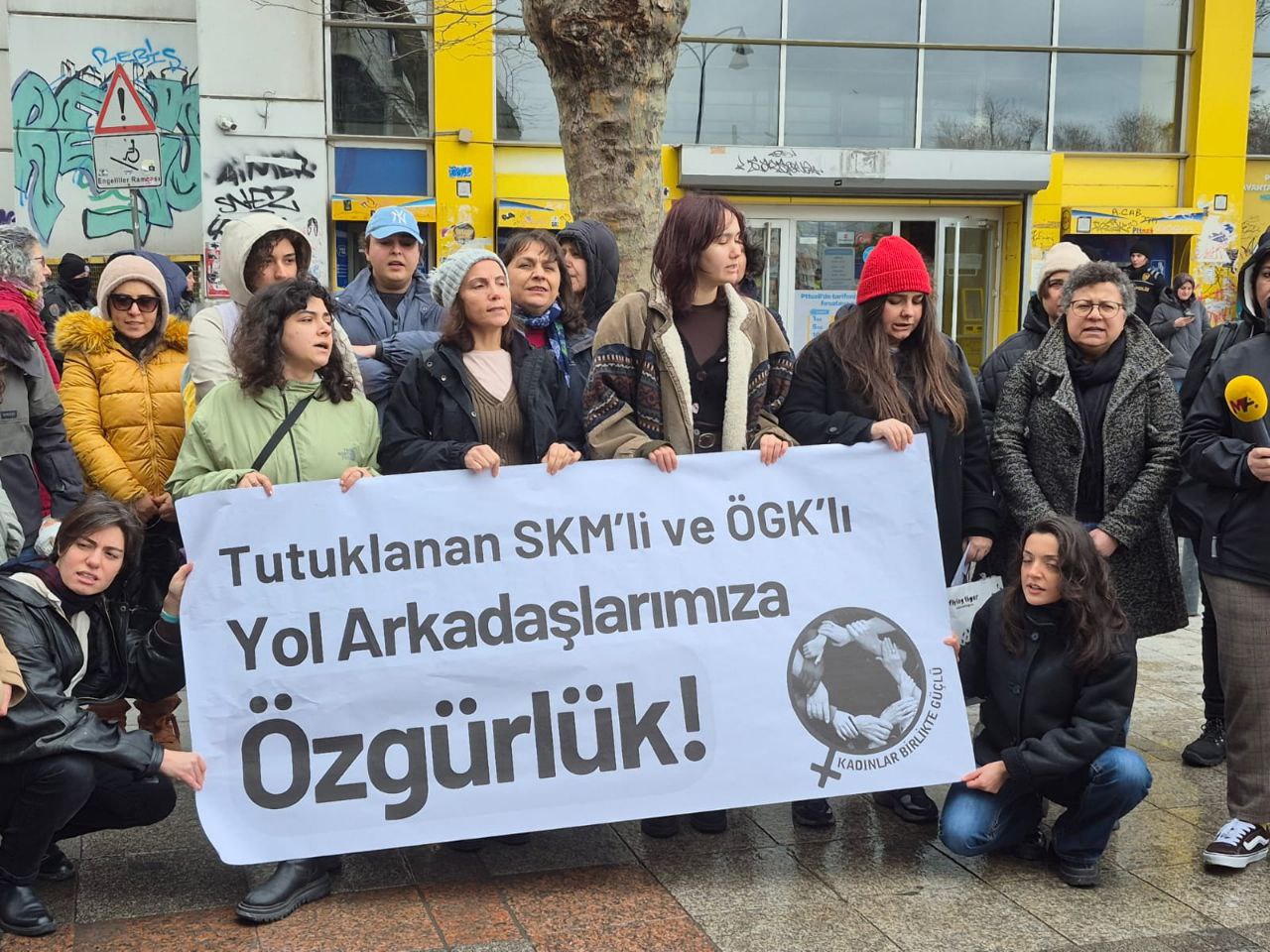 Kadınlar Birlikte Güçlü (KBG), 3 Şubat'ta sosyalistlere yönelik siyasi kırım saldırısında tutsak edilen Sosyalist Kadınlar Meclisi (SKM) ve Özgür Genç Kadın (ÖGK) üyesi kadınlara mektup ve kart göndermek için Kadıköy PTT önünde bir araya geldi. "Tutuklanan SKM'li ve ÖGK'lı yol arkadaşlarımıza özgürlük" pankartının açıldığı eylemde "Yaşasın kadın dayanışması" sloganı atıldı.