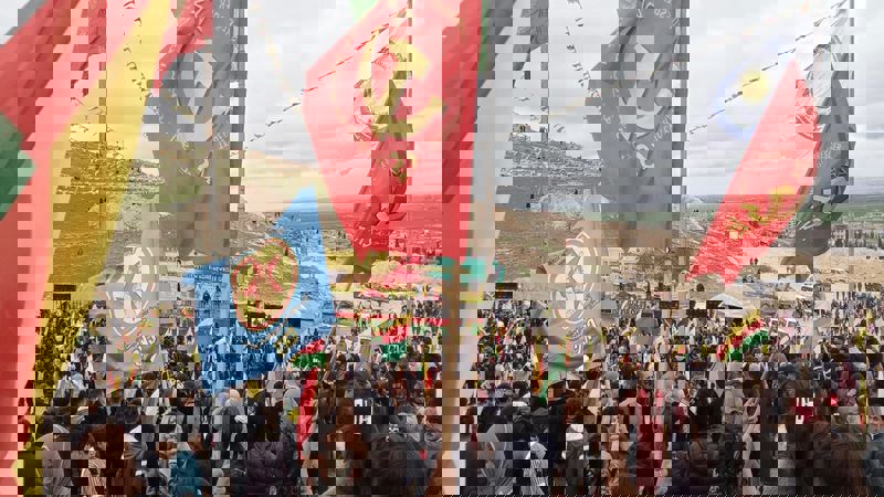 Newroz kutlamasına özerk yönetime bağlı kurumlar, siyasi partiler ve kadın örgütler ile devrim savaşçıları katıldı. Rojavalı komünistler de alanda bayraklarıyla yerlerini aldı.