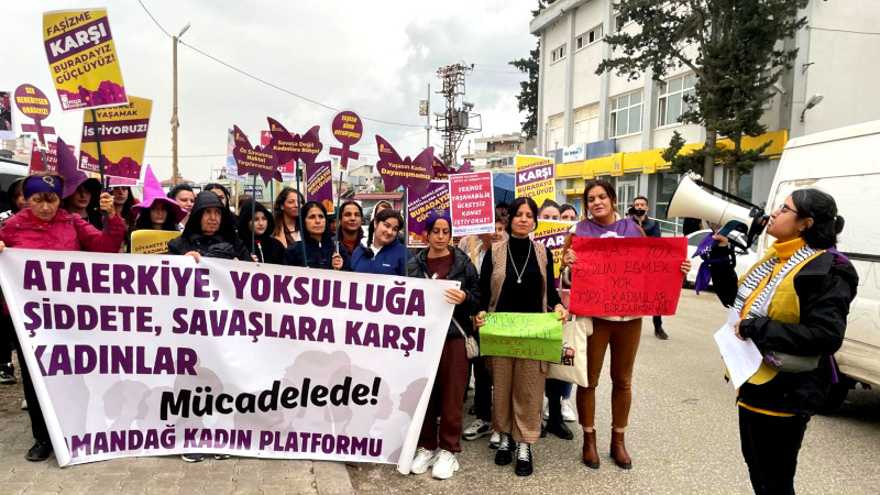 Samandağ'da bir araya gelen kadınlar 25 Kasım'da bir kez daha erkek egemen sisteme, yoksullaşma krizine, şiddete, savaşlara karşı mücadele edeceklerinin altını çizdi. Eylemde, "Hayatı çalınan tüm kadınlar için bugün sokakta ve isyandayız" dedi.
