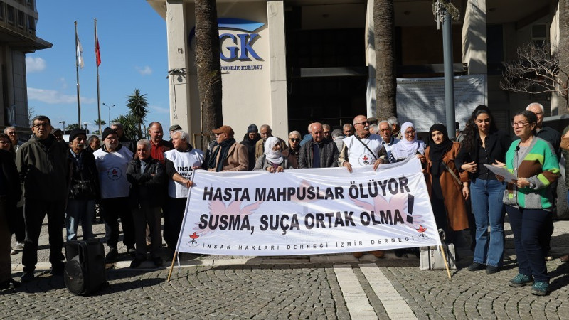 İHD İzmir Şubesi, hasta tutsakların durumuna dikkat çekmek için 2 haftada bir düzenledikleri eylemi eski Sümerbank önünde yaptı. "Hasta mahpuslar ölüyor, susma suça ortak olma" pankartının açıldığı açıklamaya çok sayıda kişi katıldı. Basın metnini okuyan İHD Yönetim Kurulu Üyesi Gülay Bilici, Bodrum S Tipi Kapalı Cezaevi'nde tutulan Sait Toraman'ın sağlık durumunu aktardı.