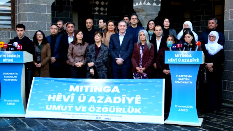 Diyarbakır'da 4 Ocak'ta İstasyon Meydanında düzenlenecek "Umut ve özgürlük" mitinginin deklarasyon açıklamasında Demokratik Kurumlar Platformu, Öcalan'a özgürlük talebini en güçlü irade ile sahiplenmek ve gerçekleştirmek için mitinge çağırdı.